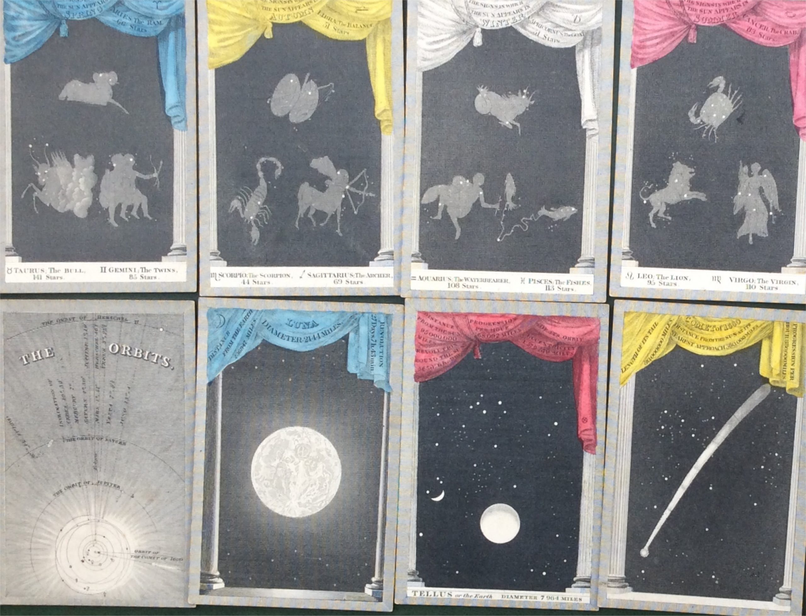 Illustrations are of men standing on a circle representing the earth. The relative positions of the sun and the moon are shown on other cards.